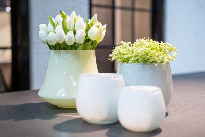 Die mundgeblasenen Glasvasen und Töpfe der DutZ Kollektion sind von hoher Qualität und nicht nur für Blumen oder Kerzen geeignet, sondern auch sehr dekorativ mit Pflanzen.